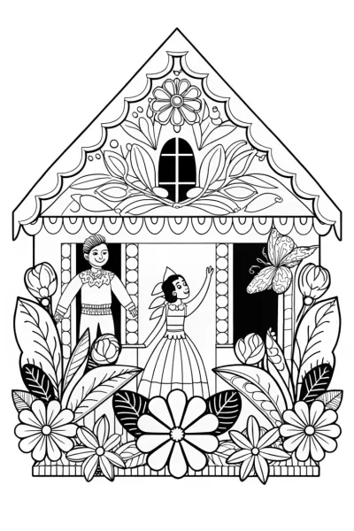 This coloring page shows Mirabel and Isabela from the Madrigal family having fun in front of their magical home, the Casita. Mirabel holds a glowing candle while Isabela has a bunch of colorful flowers, making the scene bright and cheerful.