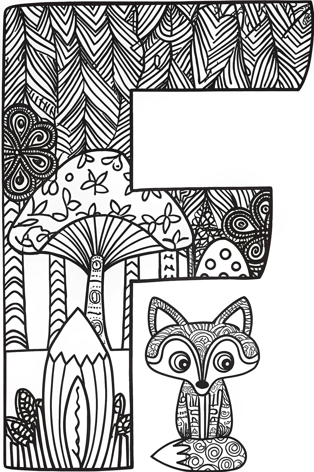 This coloring page features a large letter 'F' decorated with fun patterns and designs. It's surrounded by colorful balloons and musical notes, making it look like a celebration.