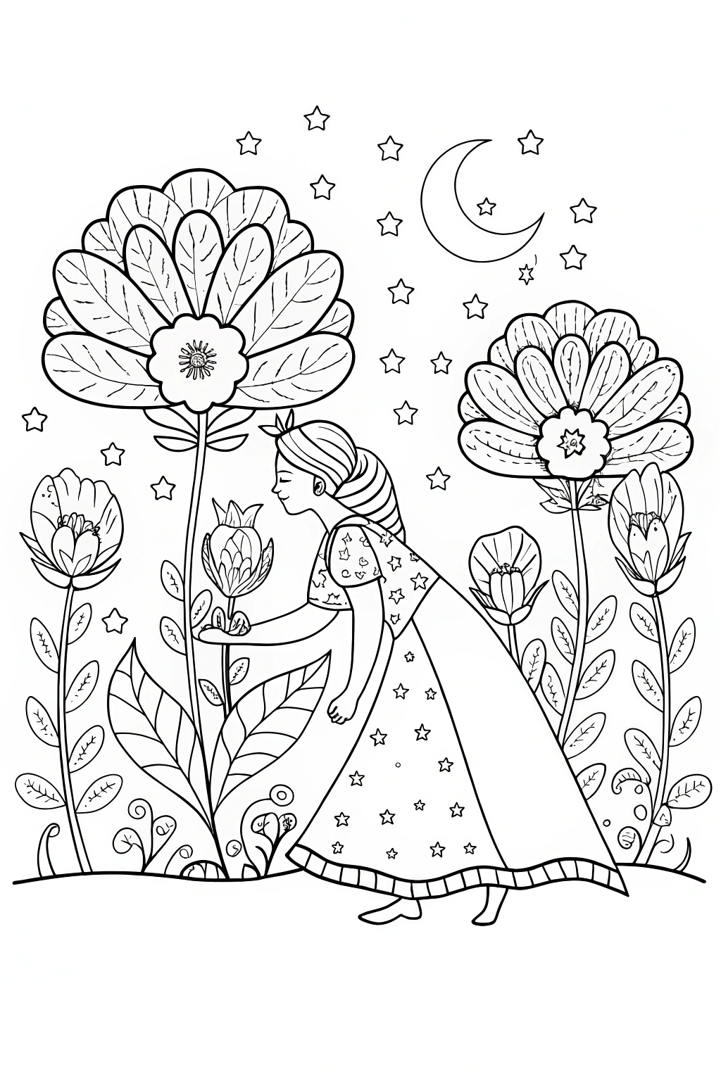 This coloring page shows a joyful princess sailing in a boat made of petals on a sparkling river. She is surrounded by friendly fish and floating lanterns that light up the scene.