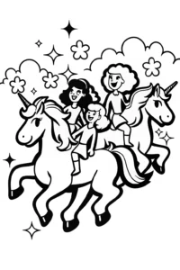 In this enchanting scene, the Rainbow High students are surrounded by a whimsical landscape filled with playful flowers, sparkling stars, and fluffy clouds. The unicorns are beautifully designed, adding a touch of fantasy to the overall image. It’s a perfect canvas for young artists to bring their imagination to life through coloring.