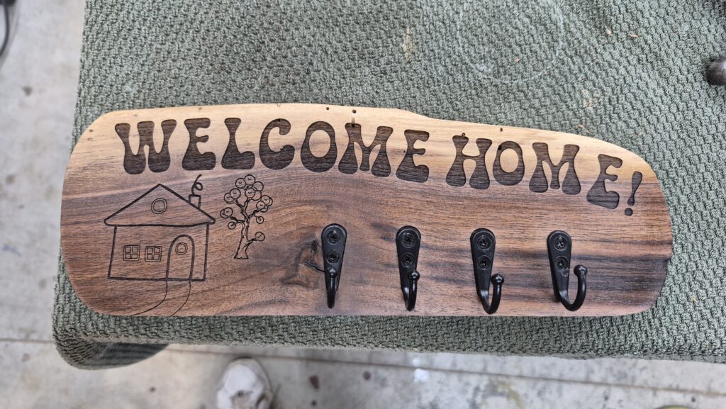 Ten minutes on ColorBliss solved what hours of scrolling couldn’t. The final piece pairs a whimsical berry tree with a charming cottage, laser engraved into a gorgeous piece of live-edge hardwood. Four hooks keep the family’s keys organized while the whole thing says “you’re home” every time you walk in the door.